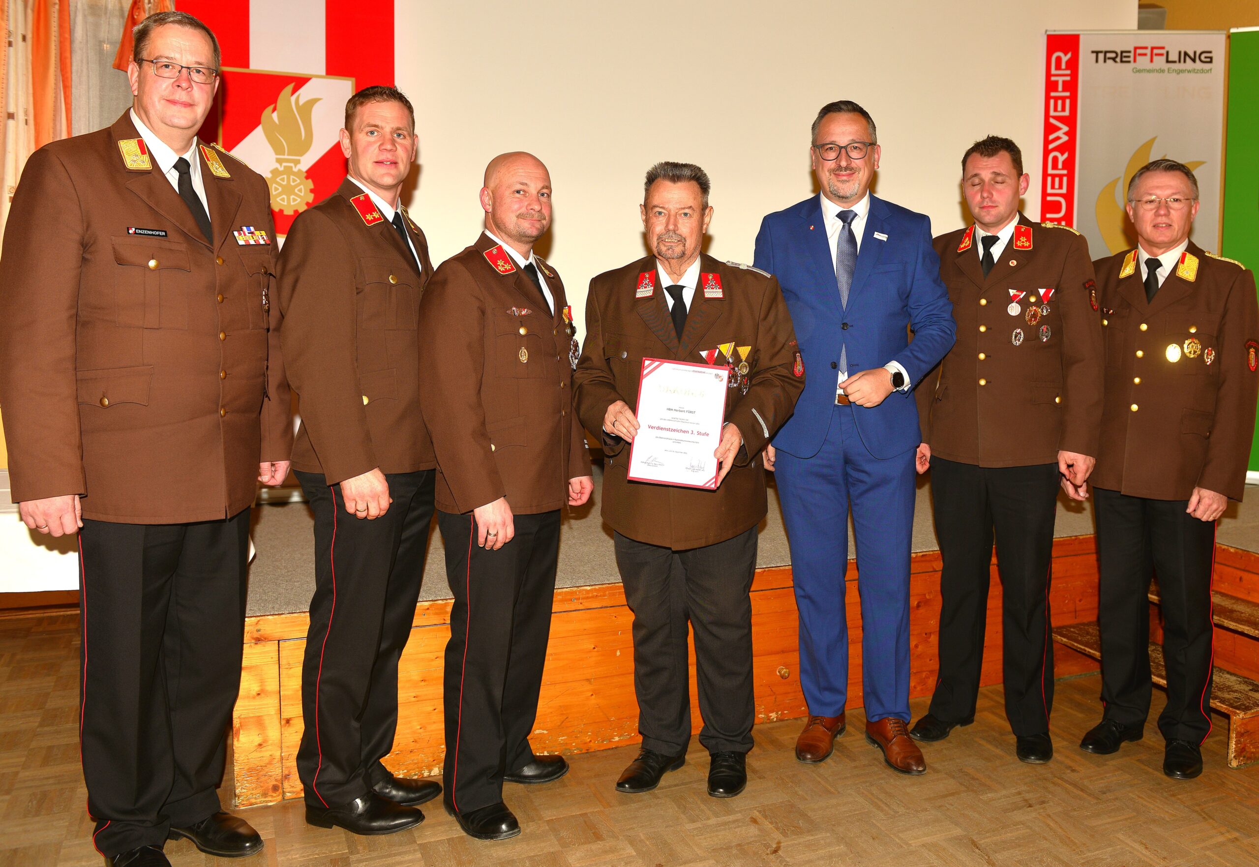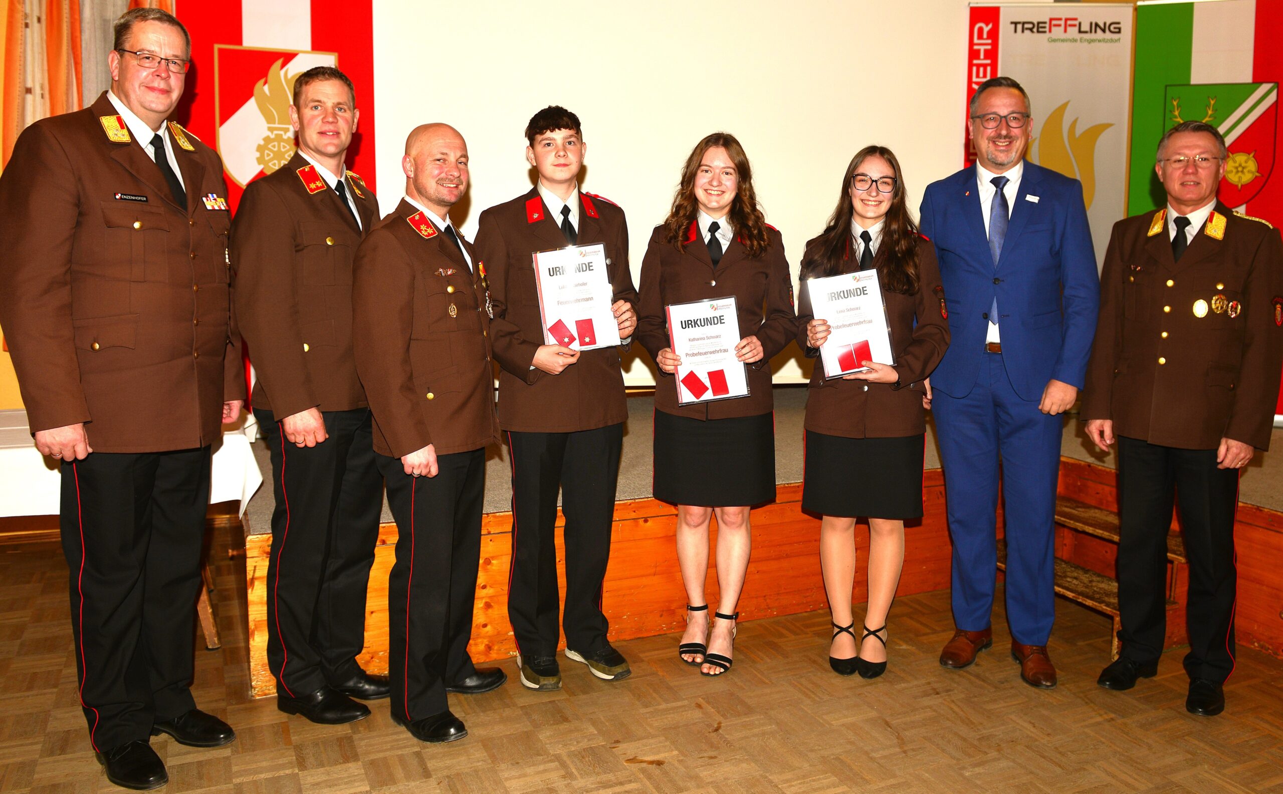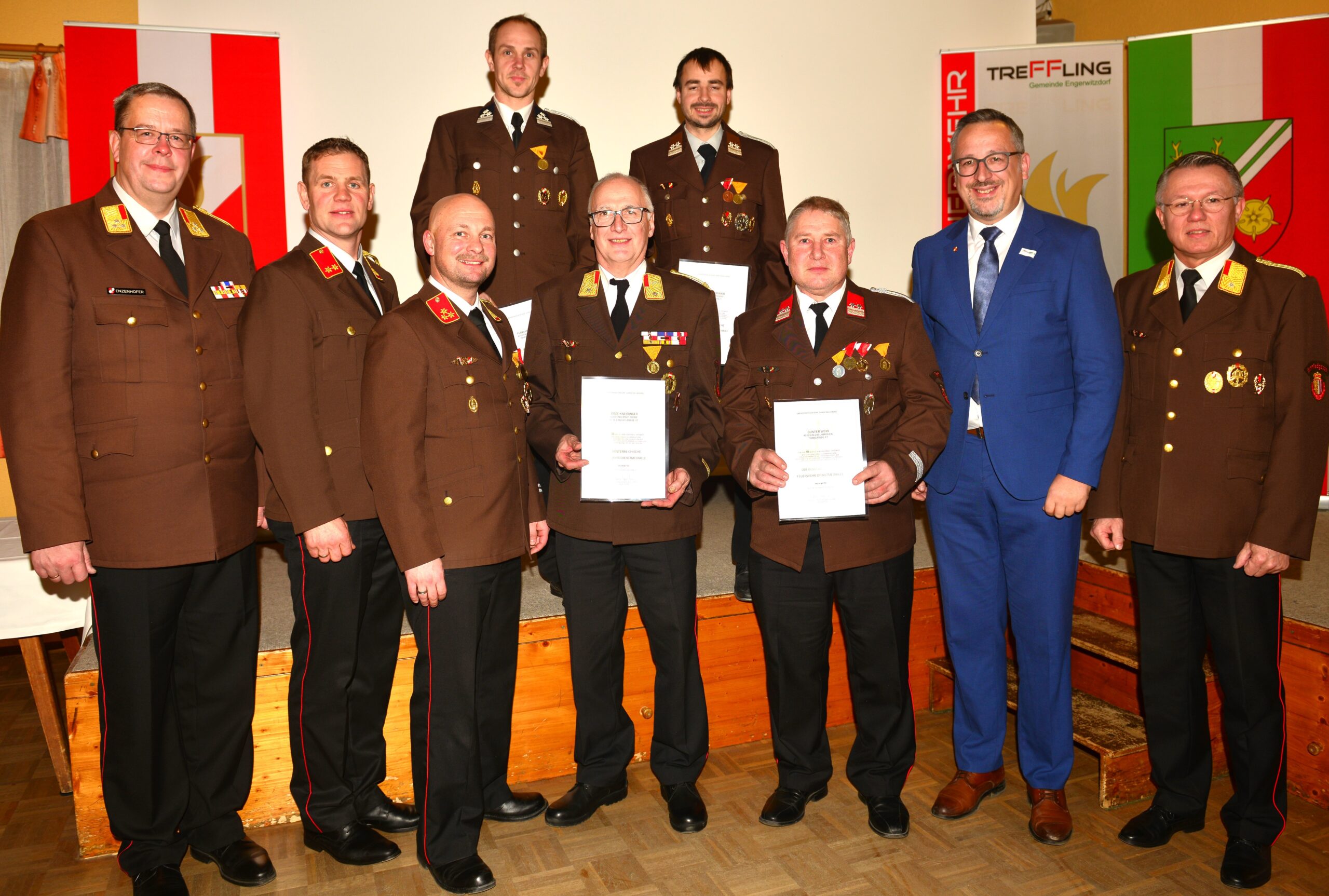 Das Kommando durfte im Anschluss an die Berichte drei neue Feuerwehrkamerad:innen in den Aktivstand angeloben sowie zwei Beförderungen aussprechen und die entsprechenden Urkunden und Dienstgrade überreichen. Es folgte die Verleihung von Ehrendienstgraden für Kameraden mit besonderen Verdiensten für die FF Treffling und die Ehrungen von Mitgliedern für ihre langjährige, ehrenamtliche Tätigkeit im Dienste der Feuerwehr. Die Beförderungen und Ehrungen wurden gemeinsam mit Bezirksfeuerwehrkommandant OBR Ing. Johannes Enzenhofer, Pflichtbereichskommandant ABI Franz Lehner sowie Bürgermeister Christoph Meisinger vorgenommen.