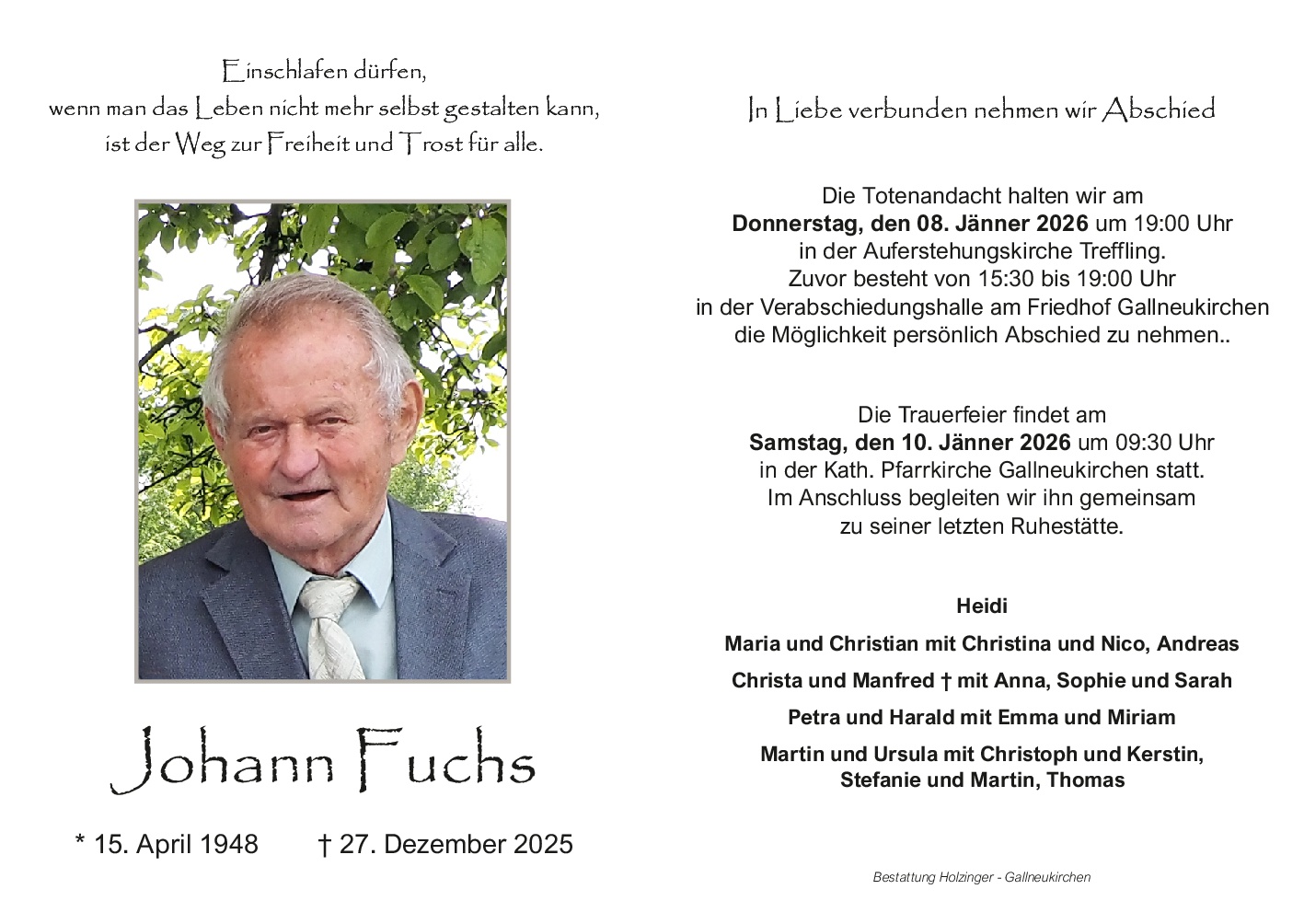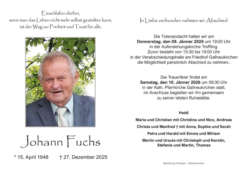 Wir haben am Sonntag, den 28. Dezember 2025 die traurige Nachricht vom Ableben unseres Kameraden Ehren-Hauptlöschmeister Johann Fuchs erhalten. Er ist am Tag davor in den Abendstunden zu Hause im Kreis der Familie friedlich eingeschlafen.