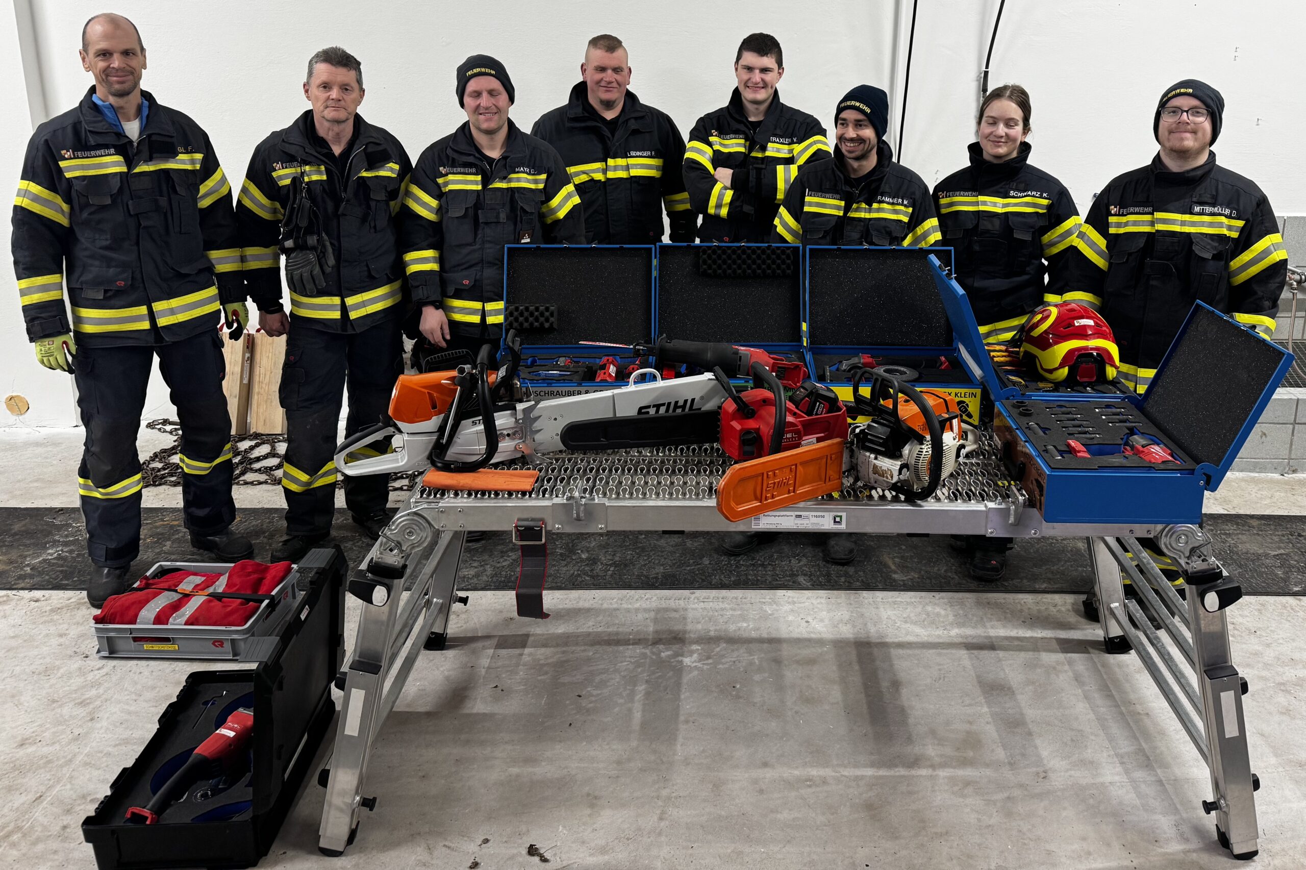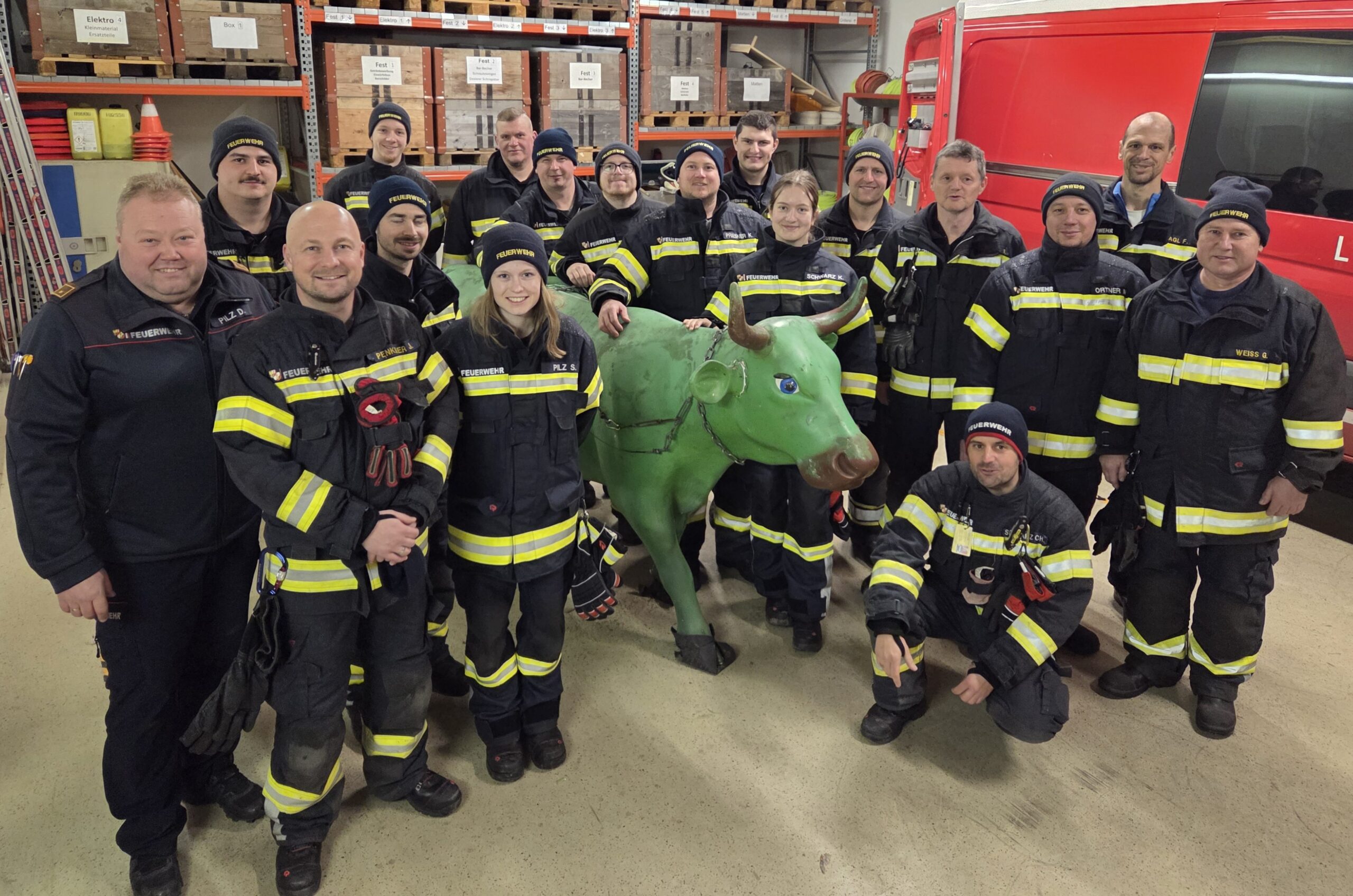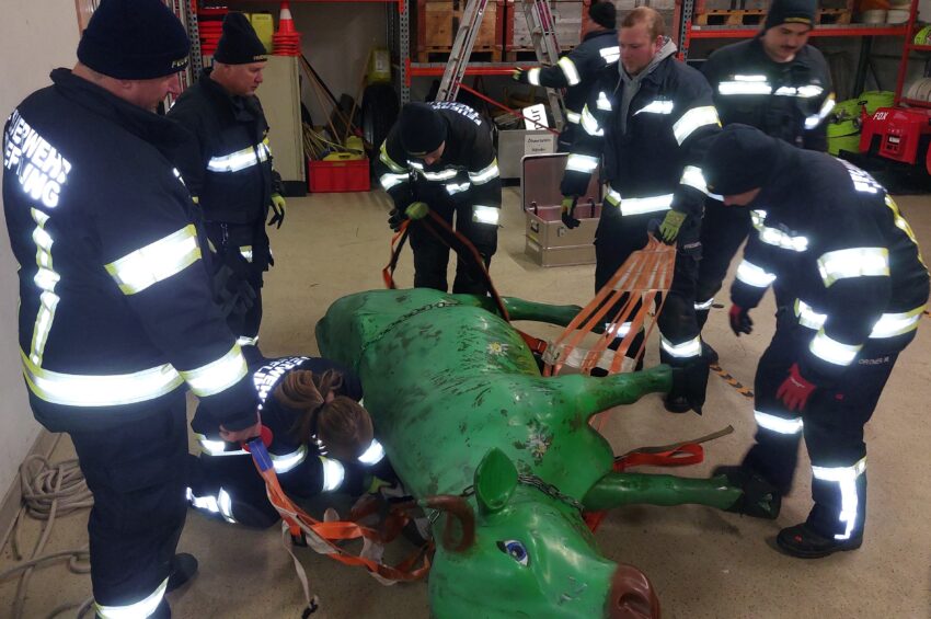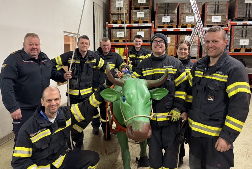 Das Rüst-Lösch-Fahrzeug RLFA 2000 mit allen im Fahrzeug geladenen Gerätschaften ist regelmäßig ein Schwerpunkt für die Ausbildungsarbeit der FF Treffling. Am 2. Mittwoch im Februar (11.02.2026) fand um 19:00 Uhr unter der Leitung von Gerätewart BI d. F. Dietmar Pilz und OBM d. F. Mathias Prammer eine Geräte-Übung mit zwei Stationen statt. Bei der ersten Station ging es beim Übungsszenario um eine fachgerechte und möglichst schonende Rettung einer Kuh mit dem Tierrettungs-Set. Für eine realistische praktische Übung wurde eine lebensgroße Plastik-Kuh organisiert und mit dieser gearbeitet. Bei der zweiten Station wurden weitere Ausrüstungsgegenstände des RLFA 2000 besprochen und praktisch angewendet. Zum Abschluss wurde in einem Übungsszenario der Fahrer eines LKWs mit dem Spineboard mittels Rettungsplattform über die Fahrertüre aus der Fahrzeugkabine gerettet. Geräte-Übungen sind eine wichtige Vorbereitung auf Einsätze, den im Ernstfall muss dann jeder Handgriff sitzen!