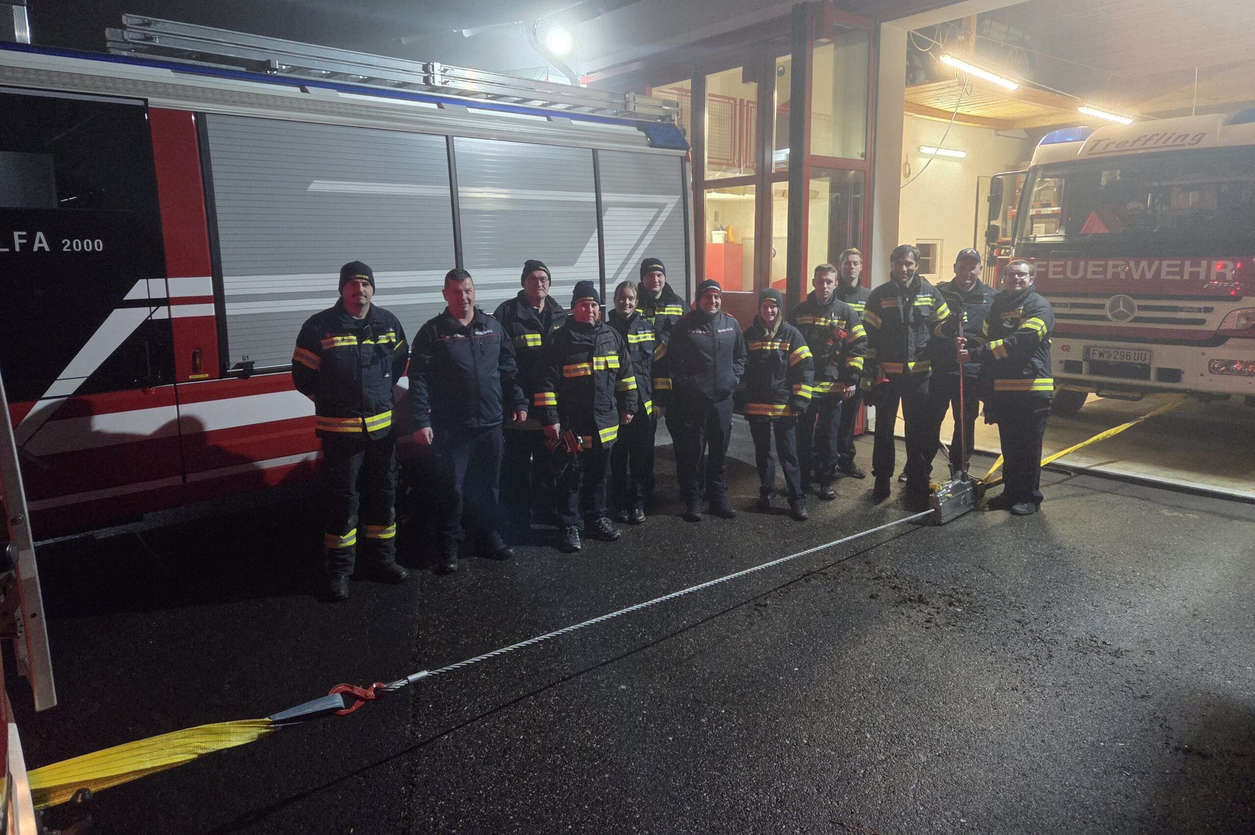 Am zweiten Mittwoch im Dezember (10.12.2025) fand um 19:00 Uhr eine Schulung der FF Treffling mit den Schwerpunkt-Themen Seilwinde, Greifzug, Anschlagmittel und Ausrüstungsteile für Hebe- und Zugarbeiten im Feuerwehrdienst statt. Die entsprechenden Gerätschaften wurden aus dem Rüst-Lösch-Fahrzeug entnommen und Ausbildner OBM d. F. Dominic Mitterlehner erklärte ausführlich alle zu beachtenden technischen Details und gab Hinweise für eine optimale praktische Anwendung im Einsatzfall. Im zweiten Teil der Schulung wurde der Greifzug praktisch beübt: Das kleinere Fahrzeug LAST wurde am größeren Tanklöschfahrzeug SLF gesichert. Aufgrund des minimalen Gefälles am Parkplatz vor dem Feuerwehrhaus konnte es dann mit dem Greifzug schonend und wohl dosiert vor- und zurückbewegt werden. Das gewonnene Wissen aus dieser Schulung sollen die Teilnehmer:innen zu Beginn des nächsten Jahres dann bei einer bereits fix eingeplanten Seilwinden-Praxis-Übung umsetzen.