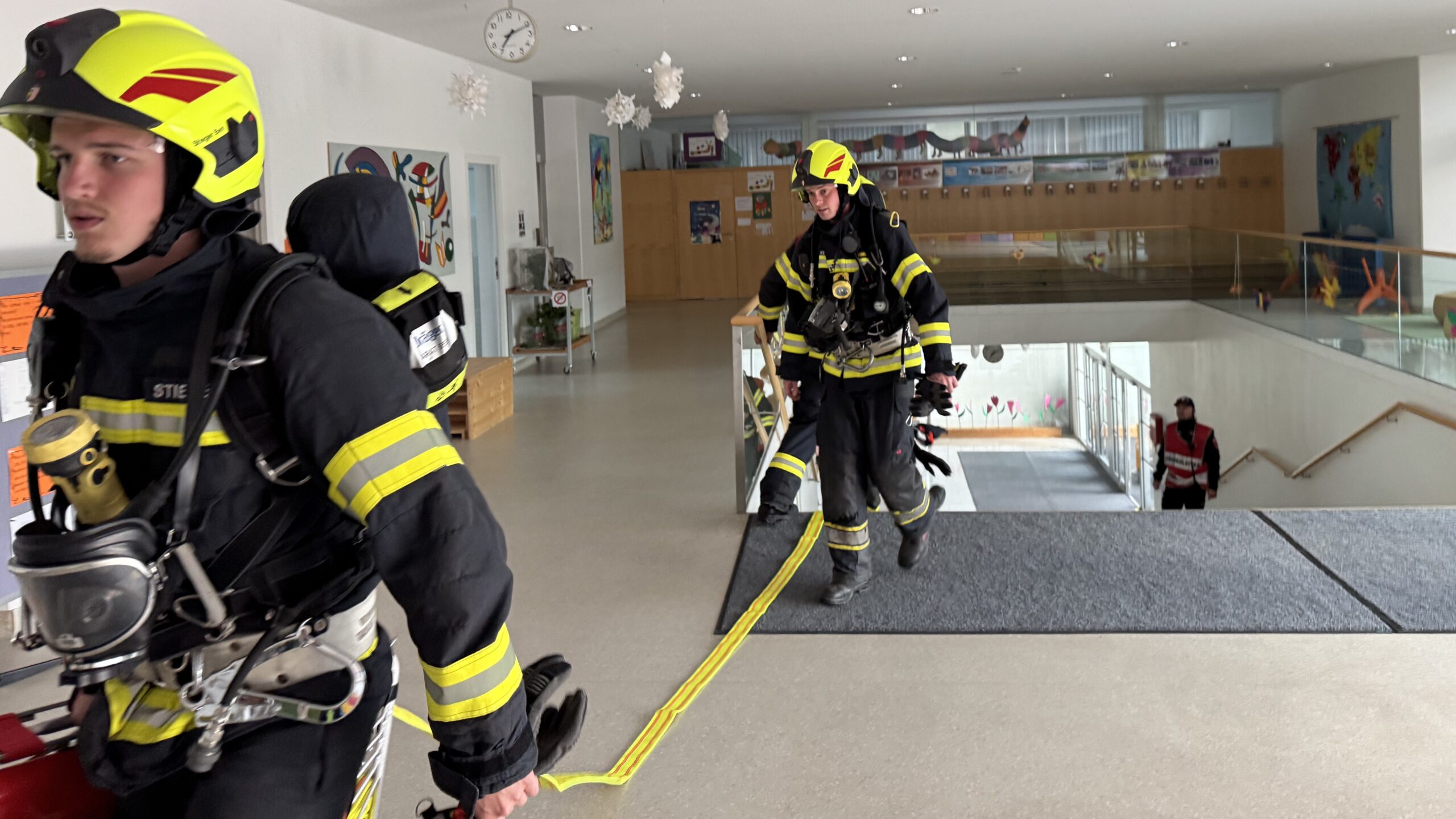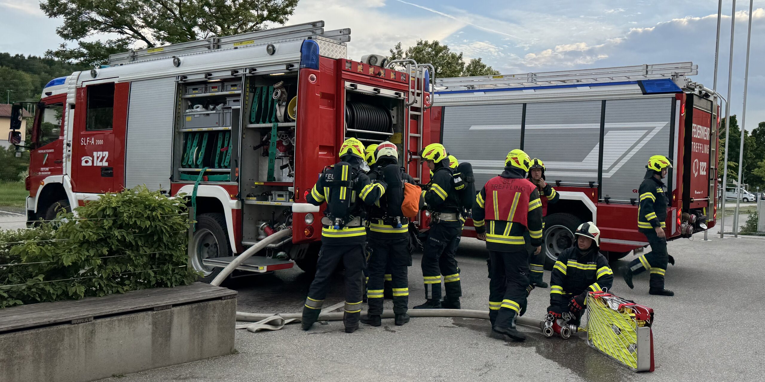 Am Mittwoch, den 21.05.2025 fand ab 19:00 Uhr die jährliche Zugsübung der FF Treffling mit den Fahrzeugen MTF, SLF, RLF und LAST und insgesamt 28 Kamerad:innen statt. Die Übungsleiter Kommandant HBI Ing. Jürgen Penkner und Zugskommandant BI Christoph Schwarz haben ein anspruchsvolles Szenario vorbereitet: In der Volksschule Mittertreffling war es bei dieser Übung zu einem angenommenen Maschinendefekt im Werkraum der Volksschule Mittertreffling gekommen, der eine von zwei anwesenden Personen verletzte und einen Brand auslöste. Nach dem Eintreffen von Einsatzleiter OBM d. F. Mathias Prammer stellte dieser nach der Befragung und Lageerkundung fest, dass der gesamte Werkraum stark verraucht war, und dass es eine vermisste Person gab. Er ordnete sofort einen Innenangriff zur Menschenrettung und Brandbekämpfung des Atemschutztrupps des SLF mit dem Schlauchtragekorb über den Haupteingang an. Dabei kam beim Eingang zum Werkraum auch der Rauchvorhang zum Einsatz. Gleichzeitig baute der Angriffstrupp des RLF einen Außenangriff zum Werkraum über den “Mondplatz” vor der Volksschule auf. Nachdem eine Abluftöffnung geschaffen wurde, startete die Hochdruckbelüftung und der Atemschutztrupp übergab die gerettete Person (unsere Rettungs-Puppe “Karl-Heinz”) zur weiteren medizinischen Versorgung fiktiv an das Rote Kreuz. Die Mannschaft des LAST baute eine Wasserversorgung vom Hydranten in der Kurve neben dem Bezirksseniorenheim zum SLF auf. Als zusätzliche Herausforderung ordnete der Übungsleiter das Herauslösen des RLF während des Einsatzes an. Nach der Meldung “Brand aus” und nachdem der gesamte Rauch durch die Belüftung entfernt war, wurde die Übung beendet. Es gab dann vor Ort noch eine kurze Nachbesprechung bevor die FF Treffling nach rund zwei Stunden wieder in das Feuerwehrhaus einrücken konnte.