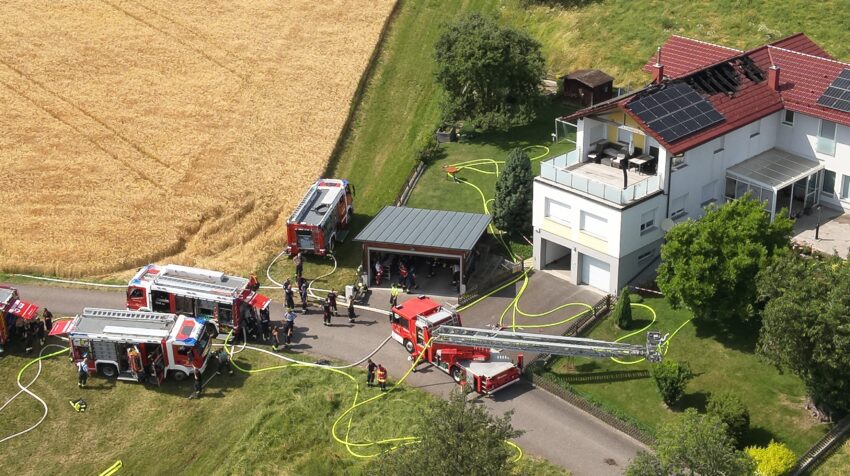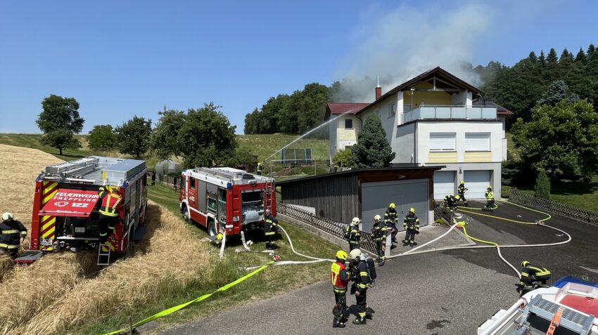 Am Donnerstag, den 26.06.2025 um 13:50 Uhr wurde die FF Treffling gemeinsam mit der FF Schweinbach und der FF Schmiedgassen zum Einsatz “Brand Gebäude” zu einem Wohnhaus am Gallusberg alarmiert. Einsatzleiter BI Christoph Schwarz rückte mit den Fahrzeugen MTF, SLF, RLF und LAST und 22 Einsatzkräften der FF Treffling zum Einsatzort aus. Der Hausbesitzer hatte im Bereich der Küche einen Brand beim Dunstabzug festgestellt. Beim Eintreffen der Feuerwehr hatte der Brand bereits auf den Dachstuhl übergegriffen. Es wurden sofort innen im Gebäude und auch außen Löschangriffe gestartet, um eine weitere Brandausbreitung zu verhindern. Die beengten Verhältnisse im Dachstuhlbereich und die hochsommerlichen Temperaturen waren eine besondere Herausforderung für die eingesetzten Atemschutztrupps. Auch die Drehleiter der FF Gallneukirchen wurde alarmiert. Im weiteren Einsatzablauf kamen auch die Einsatzführungsunterstützung (EFU) der FF Zwettl an der Rodl mit der Feuerwehrdrohne mit Wärmebildkamera und das Atemschutzfahrzeug der FF Hagenberg zum Befüllen der eingesetzten Atemschutzflaschen an den Einsatzort. Die Feuerwehren wurden von Landwirten aus der Nachbarschaft unterstützt, die mit ihren Vakuumfässern große Mengen Löschwasser zur Einsatzstelle brachten. Auch das Rote Kreuz Gallneukirchen und die Polizei waren im Einsatz. Um 15:50 Uhr konnte nach erfolgreicher Brandbekämpfung aller Glutnester im Dachstuhlbereich schließlich “Brand aus” gegeben werden. Die FF Treffling stellte eine Brandwache mit 8 Mann und führte bis 21:00 Uhr noch halbstündliche Kontrollen mit der Wärmebildkamera durch. Um 21:30 Uhr konnte der Einsatz nach rund 7,5 Stunden schließlich beendet werden.