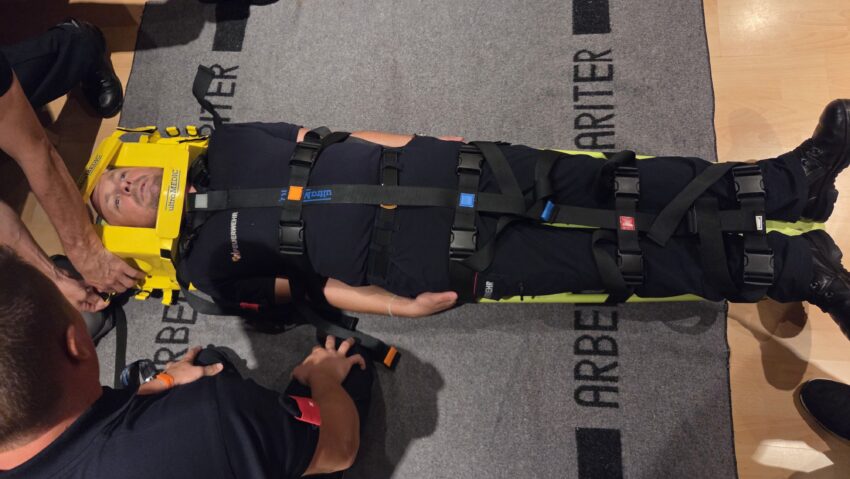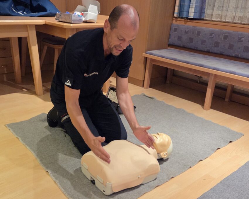 Am Mittwoch, den 10. September 2025 fand um 19:00 Uhr im Feuerwehrhaus unter der Leitung des FMD-Beauftragten HBM d. F. Florian Schinagl eine Übung der Aufgaben des “Feuerwehrmedizinischen Dienstes” (FMD) statt. Schwerpunktmäßig eingeladen waren zur Übung dieses Mal auch ganz junge Kamerad:innen, damit sie mit der Ausrüstung des FMD bei Einsätzen zur Menschenrettung vertraut werden. Die Ausbildung von Erste-Hilfe-Maßnahmen hat für die FF Treffling einen sehr hohen Stellenwert. HBM d. F. Florian Schinagl erklärte einleitend die Aufgaben des FMD und führte dann Maßnahmen wie die Reanimation mit Herzdruckmassage und Mund-zu-Mund-Beatmung sowie den Defibrillator vor. Die Übungsteilnehmer:innen hatten dann ausführlich Gelegenheit, das Vorgezeigte selber praktisch zu üben. Weitere Schwerpunktthemen waren die Tragehilfen für die Menschenrettung wie das Tragetuch für den Atemschutztrupp oder das “Spineboard”. Nach Absolvierung dieser Übung waren die 12 Teilnehmer:innen überzeugt, gut auf einen Einsatz als Ersthelfer vorbereitet zu sein.