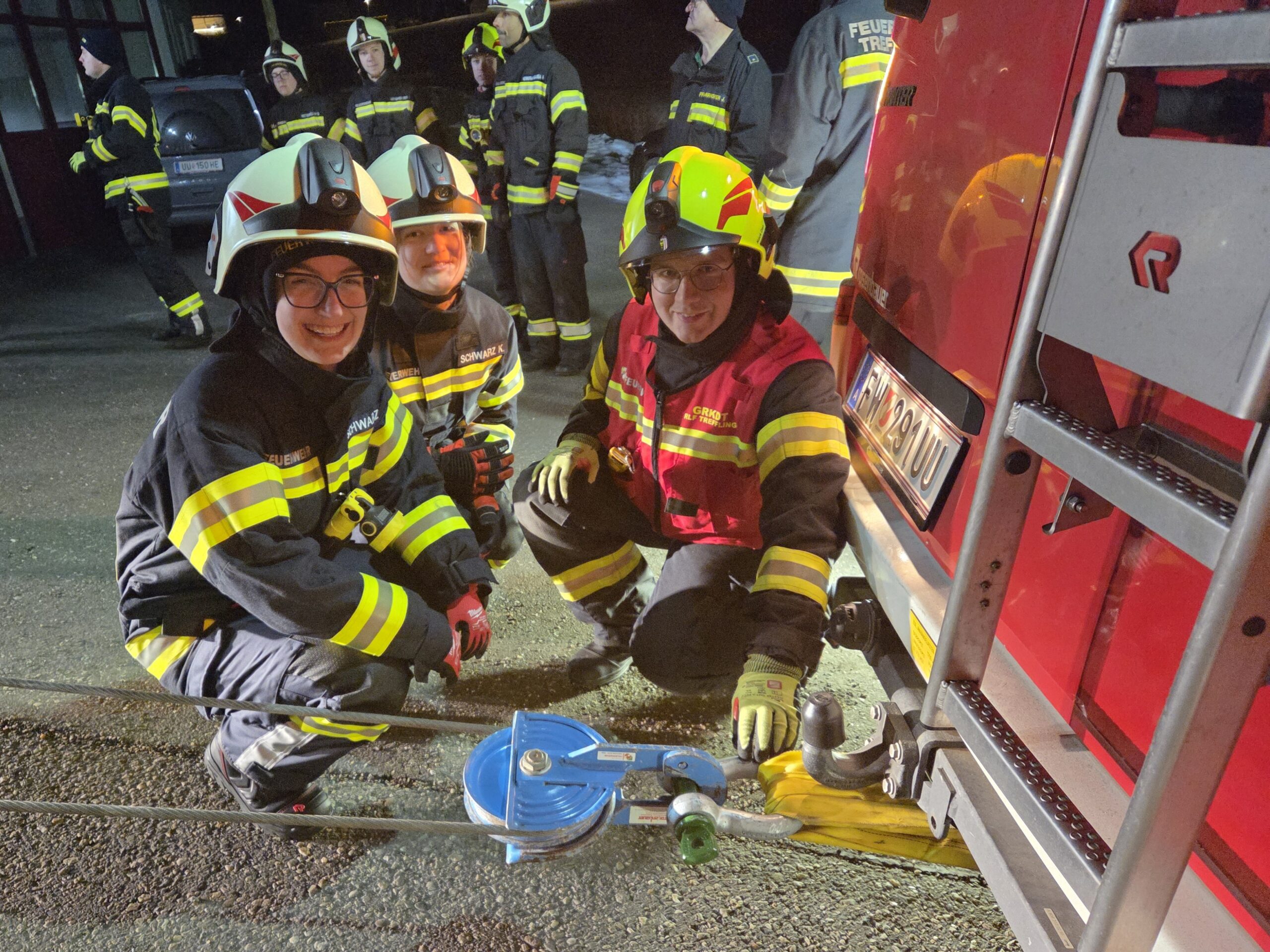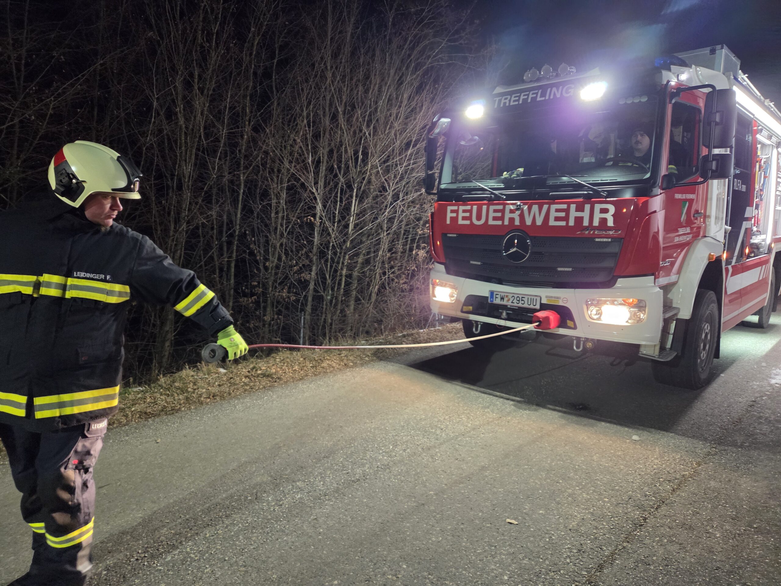 Am 3. Mittwoch im Jänner (21.01.2026) fand ab 19:00 Uhr direkt beim Feuerwehrhaus der FF Treffling eine Praxis-Übung mit der Seilwinde des Rüst-Lösch-Fahrzeuges (RLFA 2000) statt. Nachdem Übungsleiter OBM d. F. Dominic Mitterlehner am 10. Dezember 2025 bereits das theoretische Wissen vermittelt hatte, kam es bei dieser Übung nun zur praktischen Anwendung und zur Umsetzung des zuvor Gelernten. Die 21 Übungsteilnehmer:innen wurden bei dieser Übung in Einsatzmannschaften eingeteilt und der jeweilige Gruppenkommandant übernahm das Kommando. Es musste bei jedem der aufeinander folgenden Szenarien mit der Seilwinde des Rüst-Lösch-Fahrzeugs ein anderes Feuerwehrfahrzeug auf abschüssigem Gelände gesichert und gezogen werden. Dabei wurden verschiedene Seilwinden-Varianten erprobt: Mit loser Rolle, mit fester Rolle, mit und ohne Umlenkrolle. Auch die Winden-Keile kamen zum Einsatz. Die Vor- und Nachteile der verschiedenen Varianten kamen dabei deutlich heraus. Die FF Treffling ist nach dieser Übung nun für etwaige Einsätze mit der Seilwinde des RLFA 2000 bestens vorbereitet.